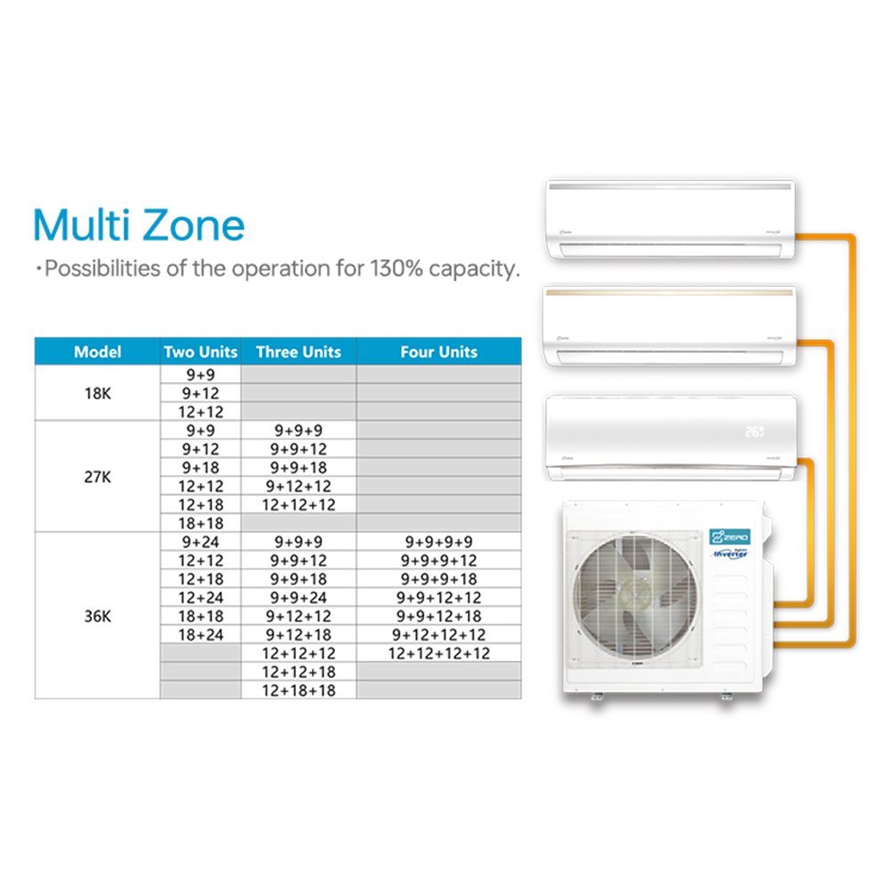 Zero brand 35000btu R410a split system air conditioner, heat pump inverter, multi zone mini split air conditioner, 30 room AC 3.5