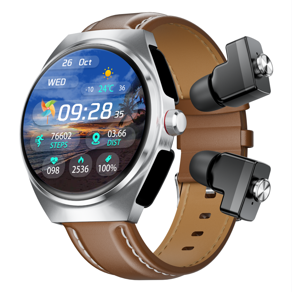 2025 Best New Smart Watch Leather Strap, 2-in-1 Earbuds and Fitness Tracker with Heart Rate Monitor