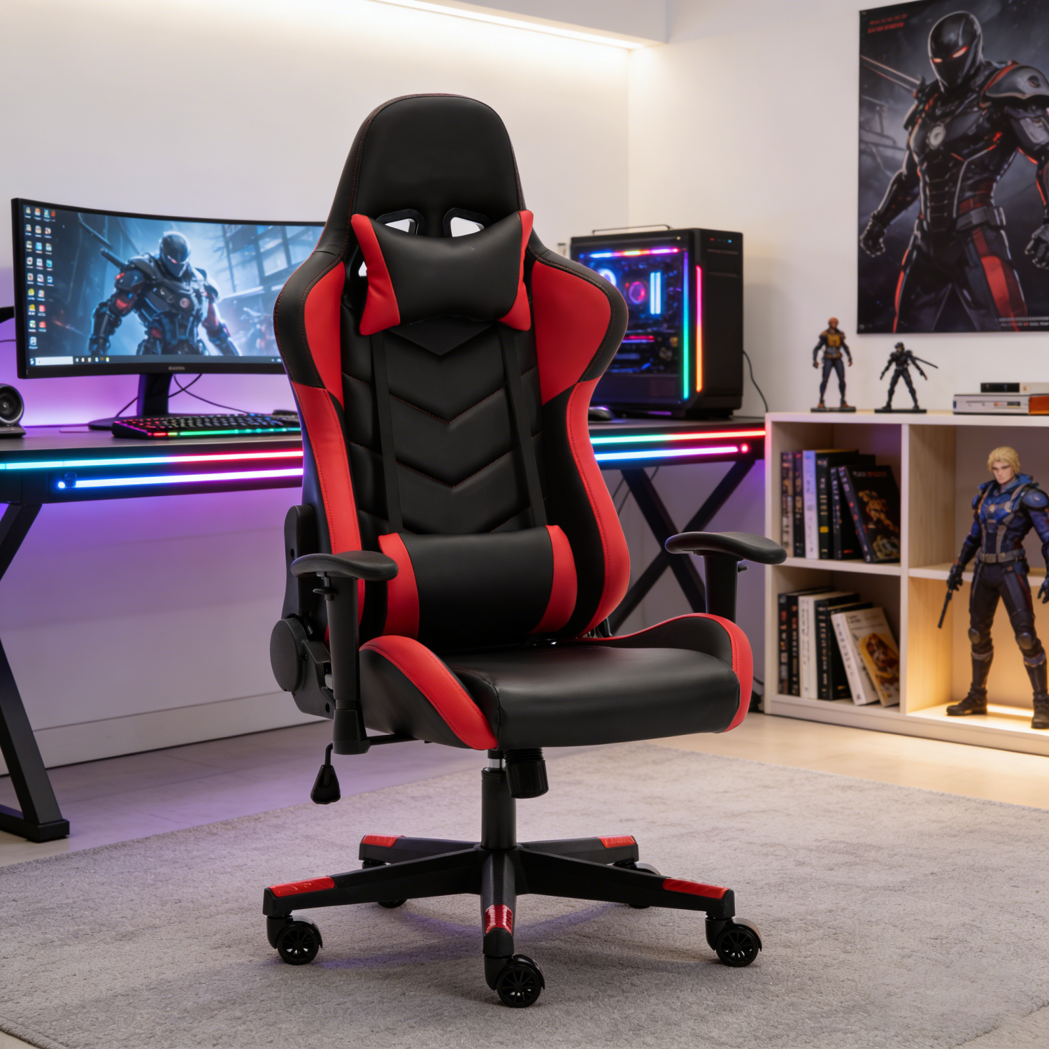 Ruibao High Back Ergonomic Gaming Chair - Industrial Design Red and Black Racing Style Reclining with Stretchable Waist Support