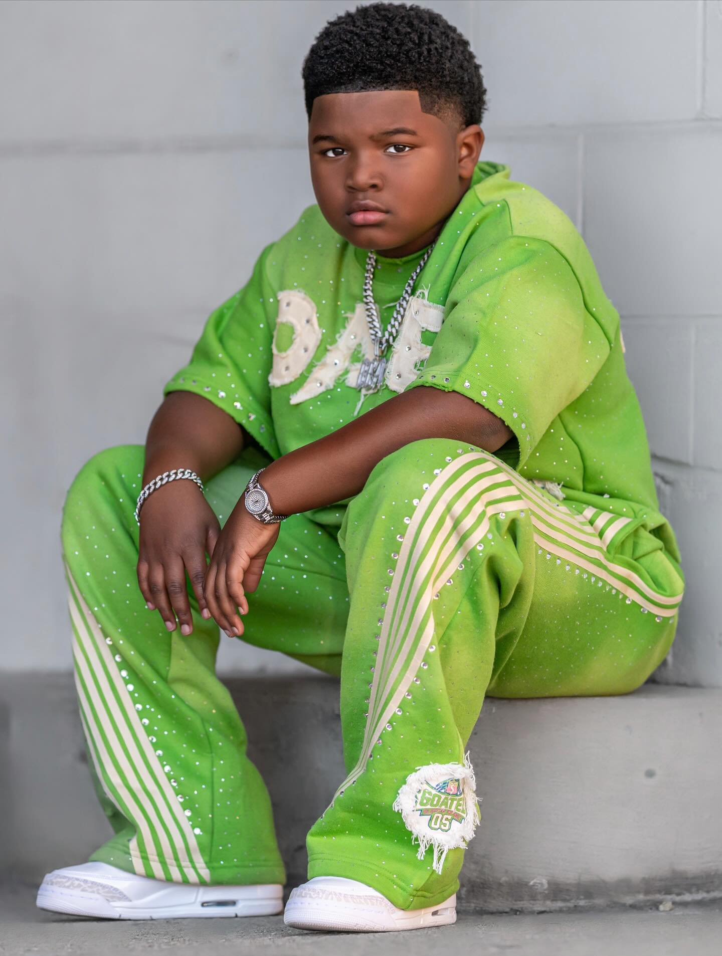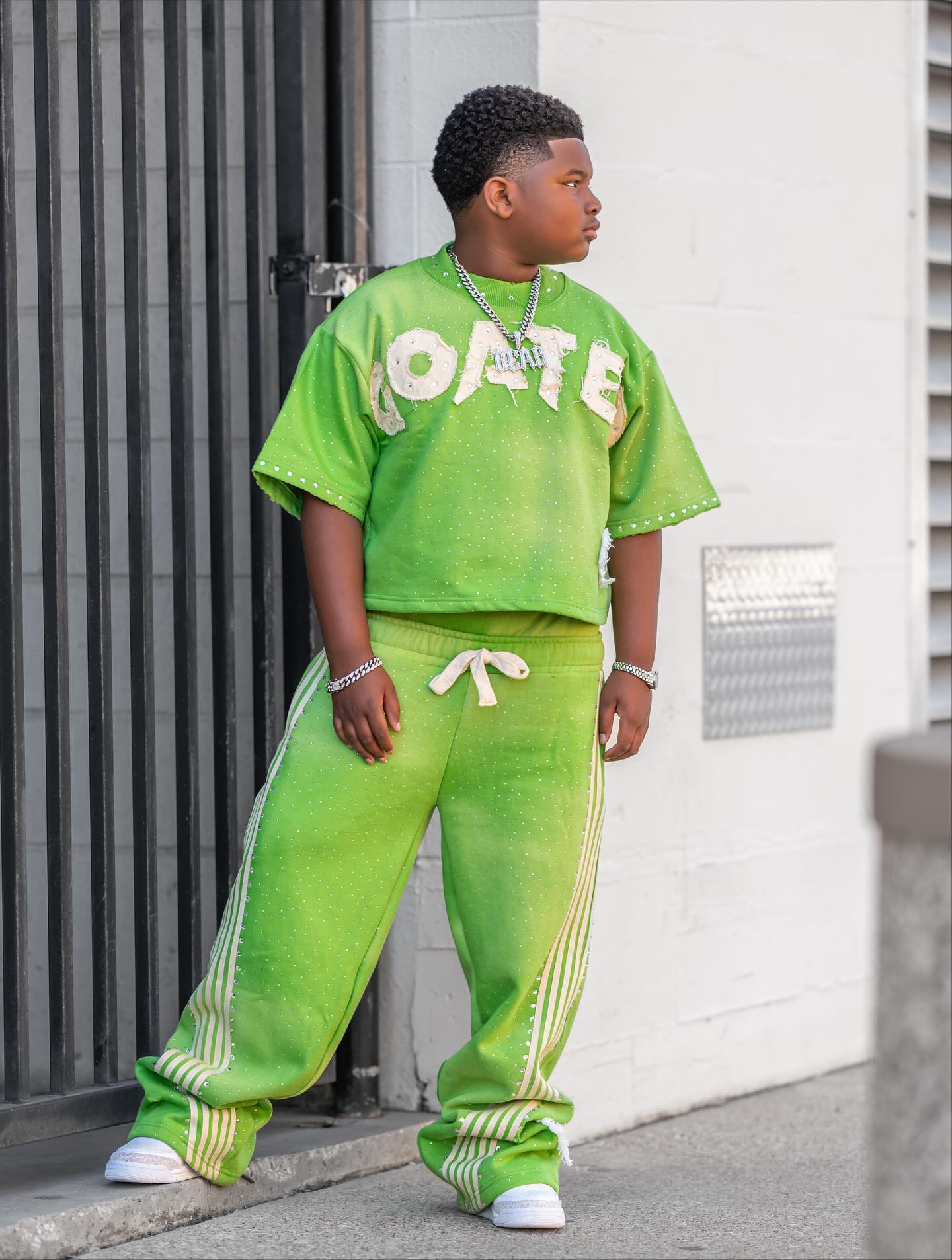 Customized appliqué patch embroidered two-piece children's tracksuit, 100% cotton, double waist striped sweatpants, 2025