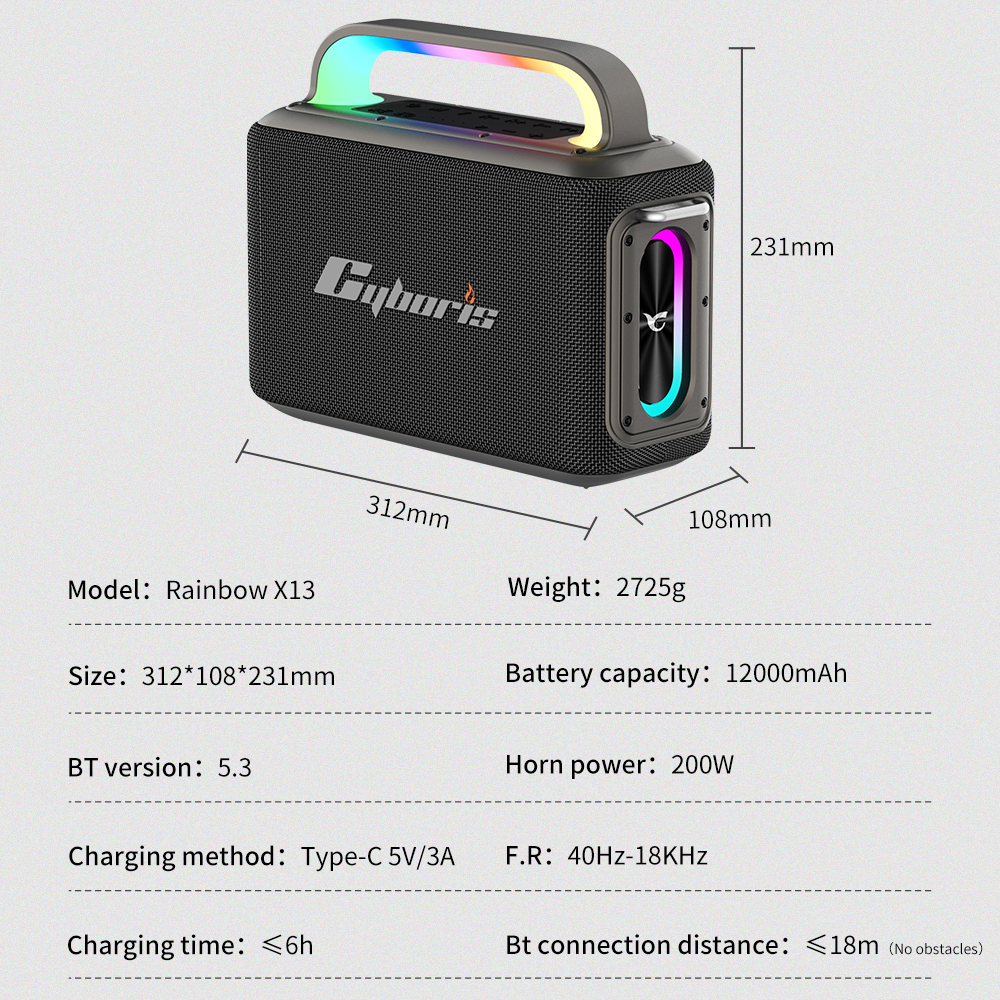 Cyboris X13 2025 new 200 watt karaoke machine portable wireless speaker 2 wireless microphone 6.5m Aux RGB LED karaoke speaker bass