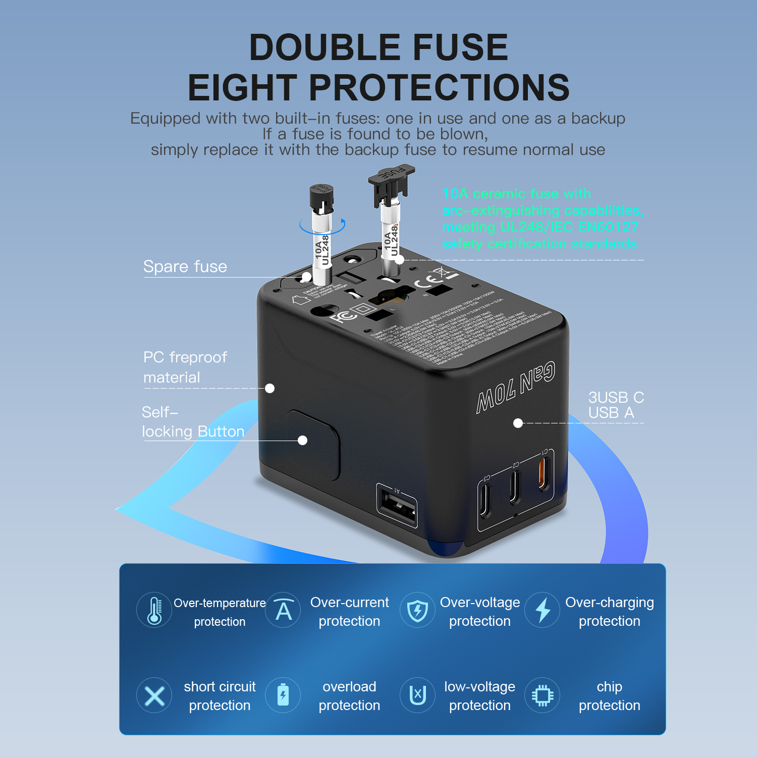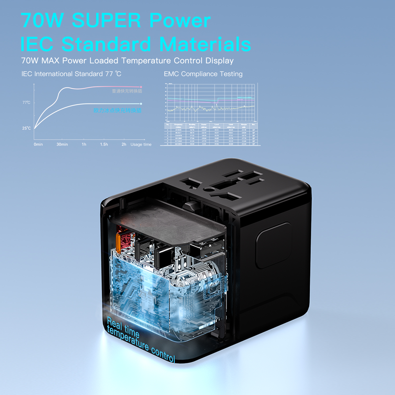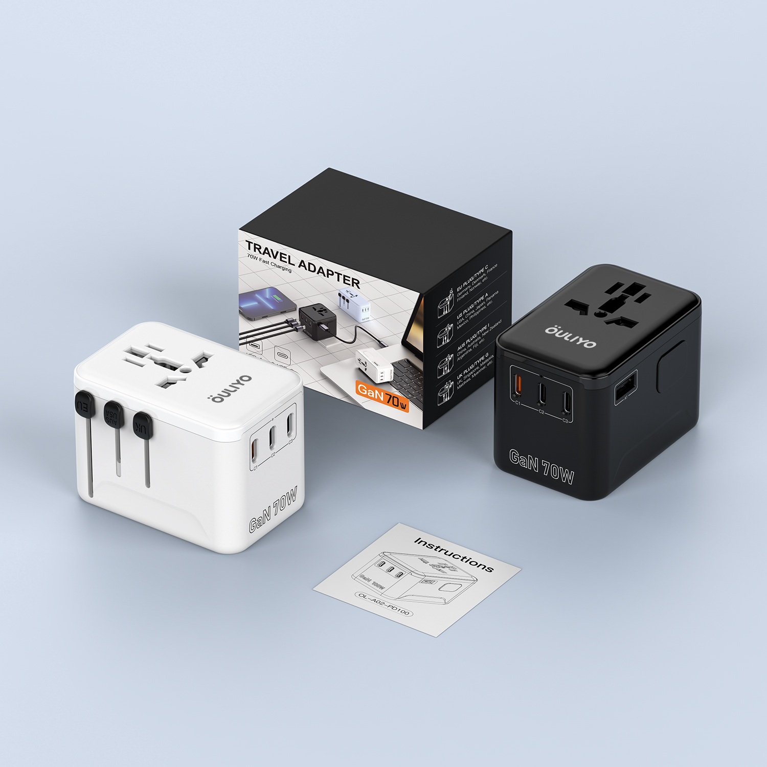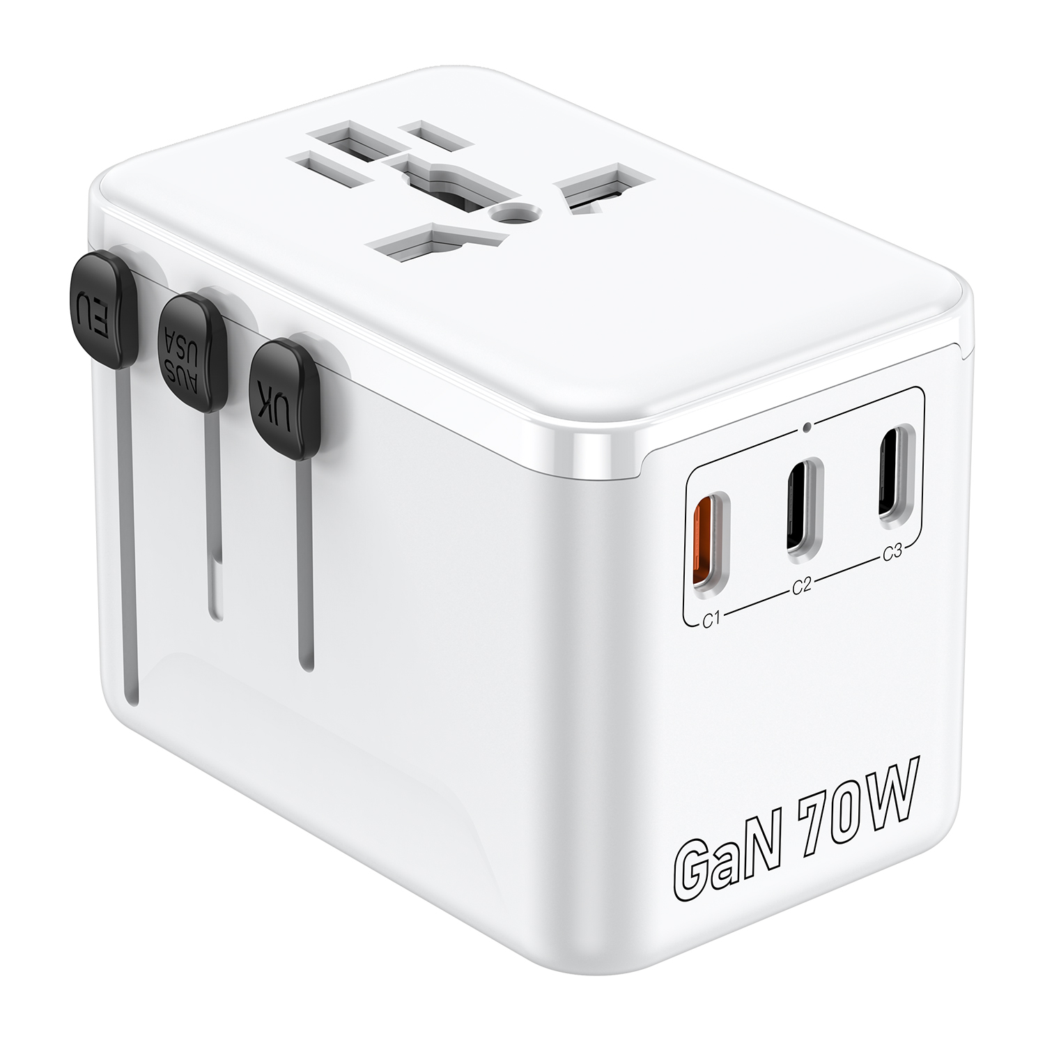 HL-A02-PD70W Universal Travel Plug Adapter Global International Fast Charging Travel Charger with 1 USB+3 T Type C